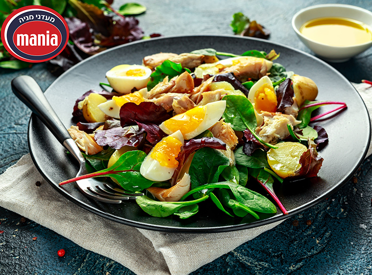 В первую очередь, мы бы хотели поделиться с вами вкусным и полезным рецептом салата с рыбой. Хорош он тем, что в нем можно использовать как запеченную в духовке рыбу, например, филе морского языка (кубики), которое продается в «Мании» по цене 24.90 ш/2 уп. по 500гр., так и рыбу холодного копчения, например, скумбрию 4.90 ш/100гр., филе сельди 3.90ш/100гр или лосось-бейби 10.90 ш/100гр, нильский окунь 11.90/100гр