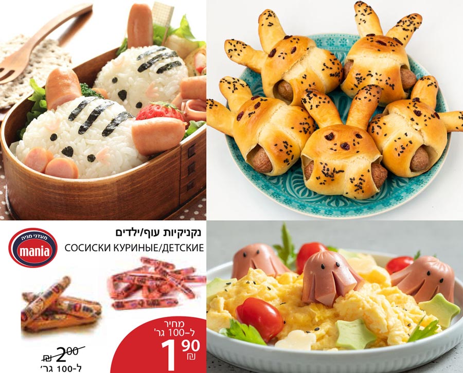 Из большого выбора, представленного в магазинах сети, мы предлагаем вам обратить внимание на те сорта сосисок, которые сейчас предложены по особенно выгодной цене: «Куриные», «Детские» за 1,90 шек/100 г, сардельки «Винер новый» за 3,90 шек/100 г, маленькие сосиски «Коктейль копченые» и «Винер» 2,20 шек/100 г.