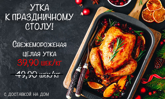 Стоимость целой свежемороженой утки – 39,90 шек за кг (вместо 49,90). Кроме целой утки вы также можете приобрести и другие ее части свежими или свежеморожеными. Утиные свежемороженые ножки, например, сейчас стоят 40 шек/ 1 кг вместо прежних 58 шекелей.