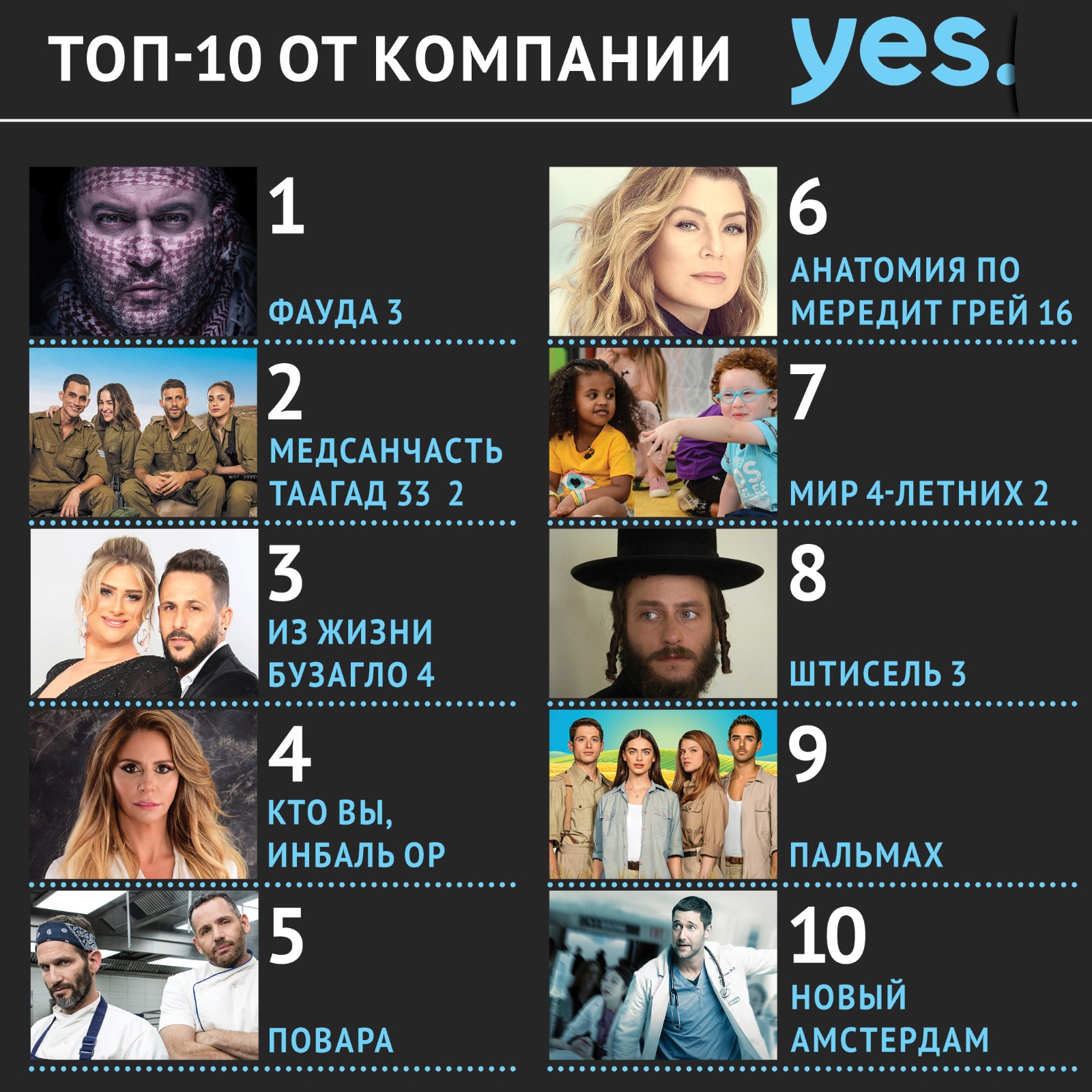 Первое место по популярности занимает третий сезон сериала «Фауда» – десятки миллионов просмотров. На втором месте – второй сезон сериала «Медсанчасть Таагад 33» с более чем десятью миллионов просмотров. Сериал «Из жизни Бузагло» (в скором времени зрителей ждет новый сезон) занимает третью позицию. Документальный фильм «Кто вы, Инбаль Ор?», вызвавший много споров, на четвертом месте, а новый сериал «Повара» занимает пятую позицию еще до окончания первого сезона! На шестом месте любимый и успешный сериал «Анатомия по Мередит Грей», который идет уже не первый год. Второй сезон документального сериала «Мир 4-летних» на седьмом месте. На восьмом – только что начавшийся третий сезон «Штиселя» (сериал вошел в список после показа первых двух серий!). На девятом месте – «ПАЛЬМАХ», популярный молодежный сериал, и на десятом – медицинская драма «Новый Амстердам».