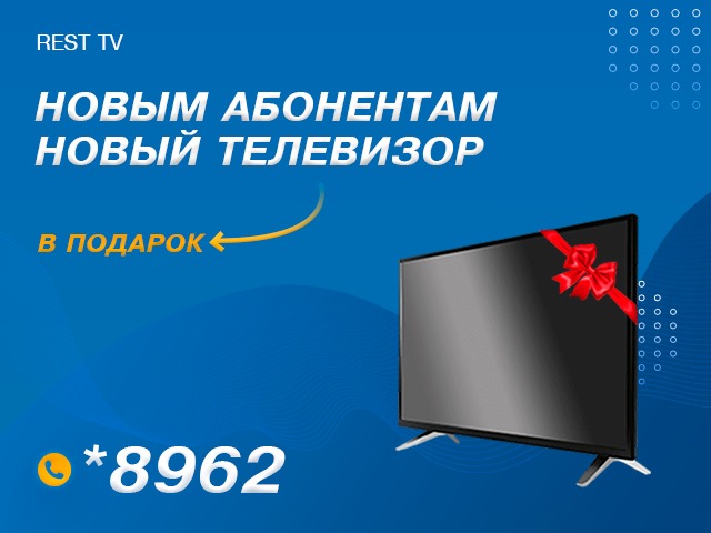 Смотрите REST TV на новехонькой плазме, полученной в подарок. Теперь каждый наш новый абонент сможет насладиться телевиденьем высокого качества на широком плазменном экране, заплатив только 149 ш ежемесячной абонентской платы. Причем цена пакета включает не только более 400 каналов из СНГ и других стран, но и домашний интернет!