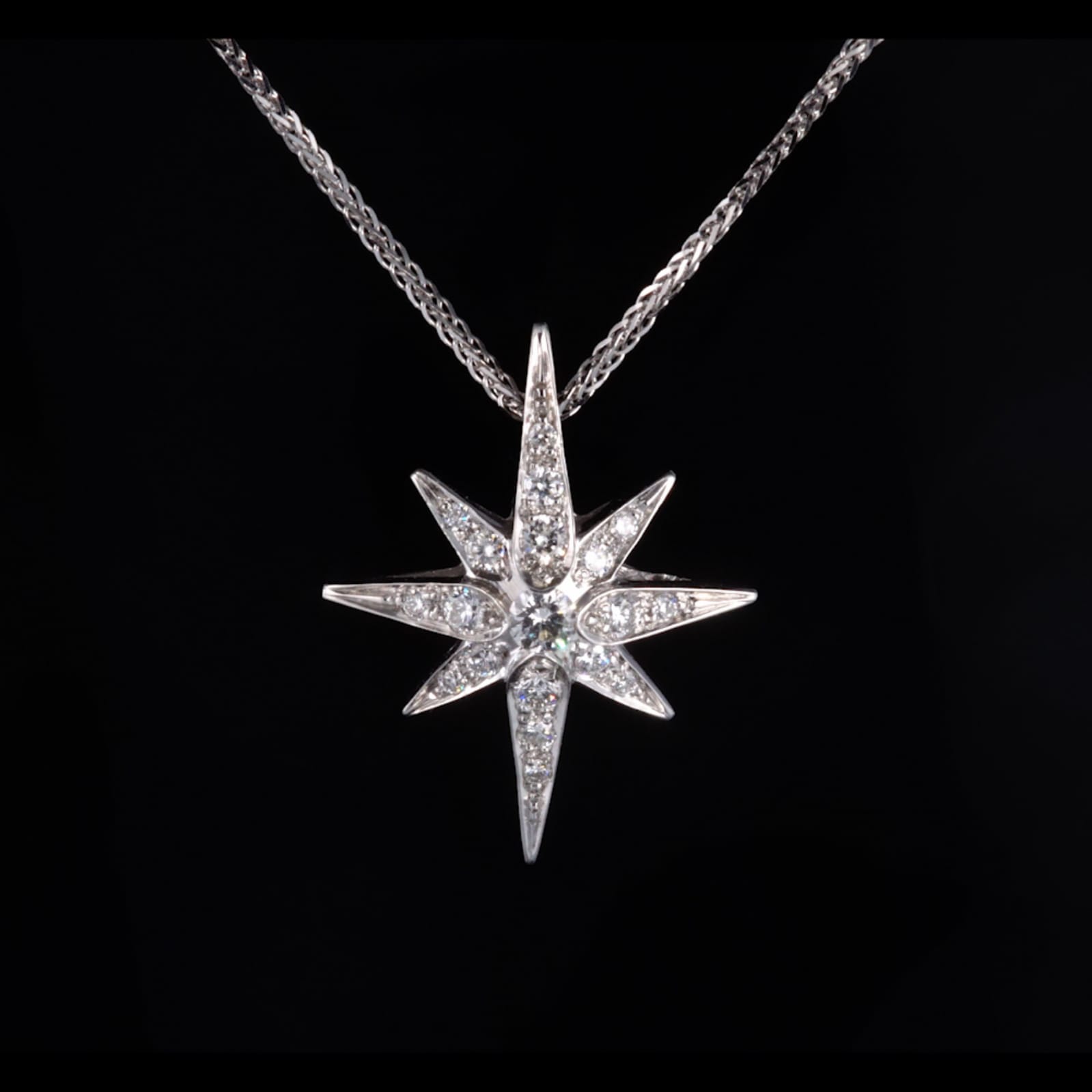 * Восьмиконечная звезда – это символ, который существует во многих культурах, в том числе и в иудаизме – это знак начинания, спасения, изобилия. Как магический амулет он приносит своему обладателю вдохновение и развитие творческих способностей, владеющие им становятся хозяевами своей судьбы и приобретают силу управлять ею. Специальная цена на кулон из белого золота с бриллиантами 0.45 карат – 2450 шекелей вместо 5200.