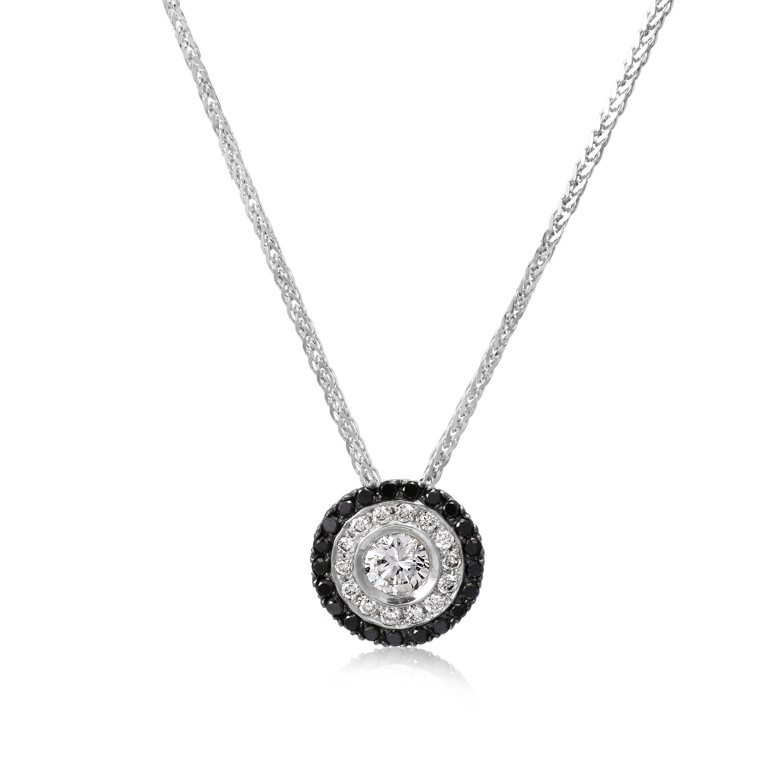*Кулон в форме круга из белого золота с центральным камнем 0.20 карат, инкрустированный белыми бриллиантами 0.10 карат и черными бриллиантами 0.11 карат. Круг – это символ солнца, круг – это символ божественного начала, черно-белый круг – это символ мужского и женского начала, это сила, защита и сама жизнь. Сегодня стоимость этого кулона 2900 шек.