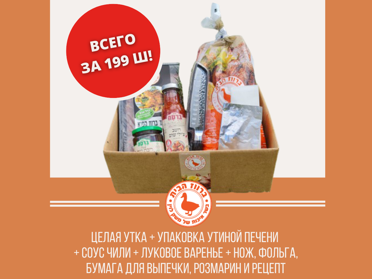 С набором «Обжорка» от “Барвазим” это станет намного проще! Сейчас вы можете приобрести набор, куда входят: целая утка + упаковка утиной печени + соус чили + луковое варенье + нож, фольга, бумага для выпечки, розмарин и профессиональный рецепт всего за 199 шекелей.
