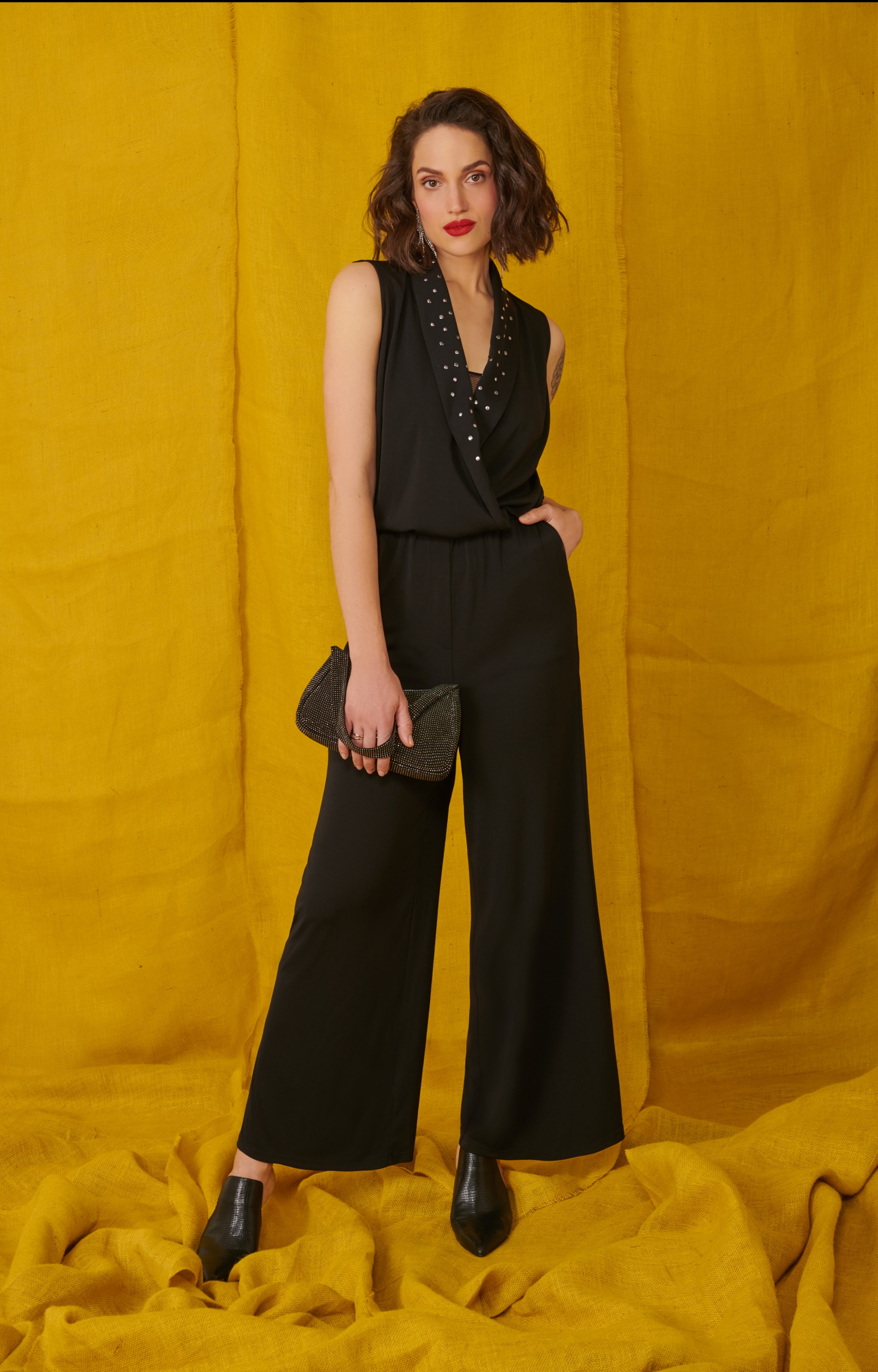 Комбинезоны – очень удобный элемент гардероба, который создает сразу целый образ. Они самодостаточны и практически не требуют дополнительных аксессуаров. Например, элегантный черный комбинезон из летней коллекции Crazy Line – великлепное решение для камерных вечеринок. Мягкий силуэт придает образу женственности, глубокое декольте добавляет чувственности, комплиментарный крой выгодно подчеркивает изгибы фигуры. Что еще нужно? Разве что немного металлических страз, которые украшают комбинезон и придают ему вечернее настроение.