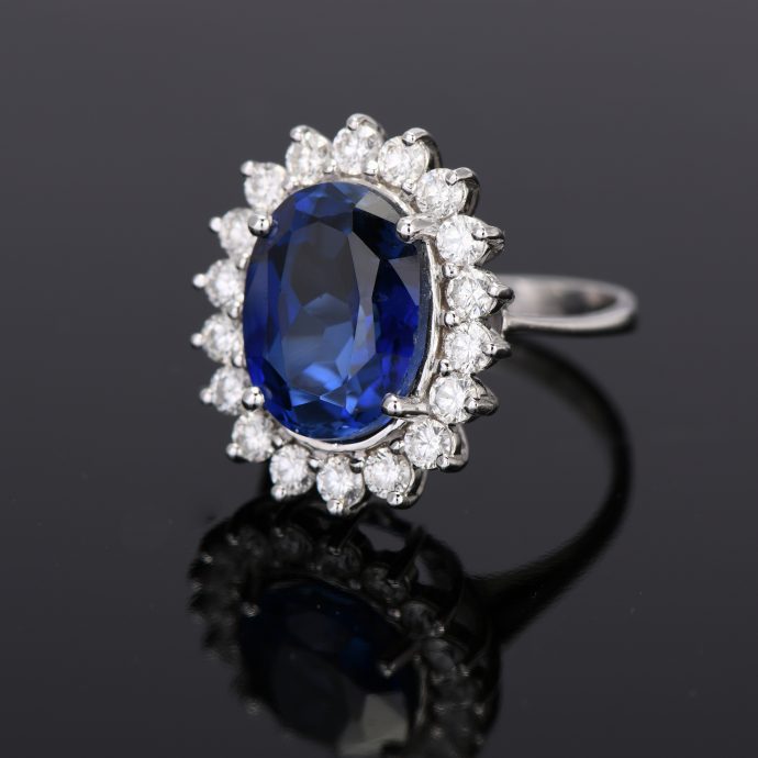 Сапфир, глубокого синего цвета, окруженный россыпью переливающихся бриллиантов, пожалуй, это самое известное помолвочное кольцо в мире, вошедшее в историю ювелирного искусства.