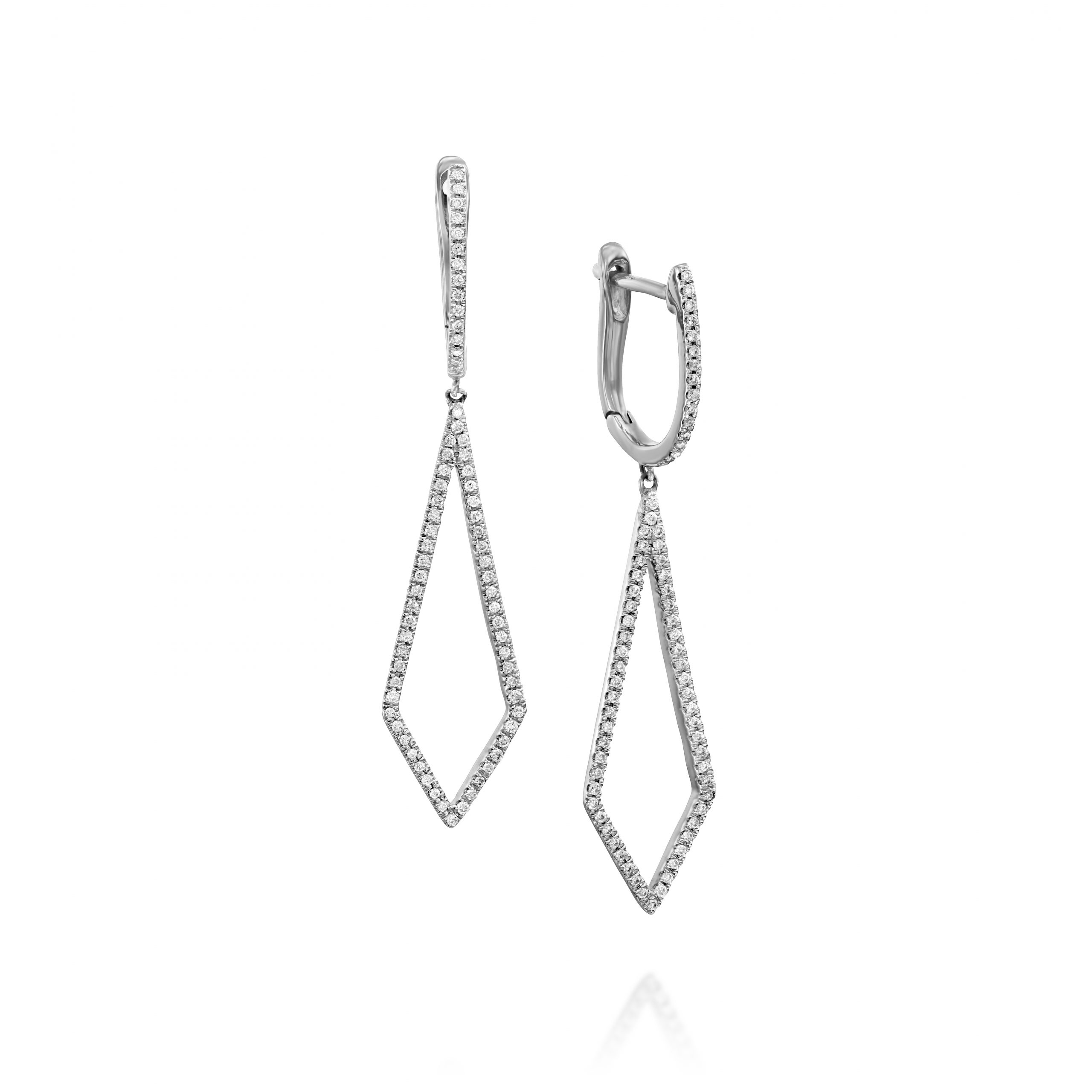 Яркая россыпь бриллиантов, окаймляющая грани геометрических узоров, подчеркивает их характер, а внутреннее, незаполненное пространство украшений придает им особую воздушность.