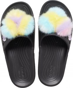 Клоги на платформе «а-ля Баленсиага» с пайетками зрительно вытянут силуэт, делая вас стройнее, а слайды – с блестками или пуховыми помпончиками – добавят трендовому образу яркости и легкости.