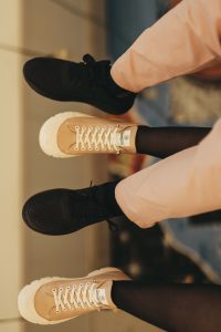 Анастасия Росина остановила свой выбор на актуальных бежевых кедах на рифленой белой подошве Seventy Nine, а Давид Росин выбрал кроссовки Crocs, удобные, невесомые и практичные, подходящие и для спорта, и для работы, и для прогулок после нее.