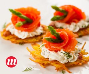 Вкусный, как сам по себе, так и в составе самых разных блюд: с блинчикам, канапе, в кише, в салате и даже вот с такими картофельными драниками!