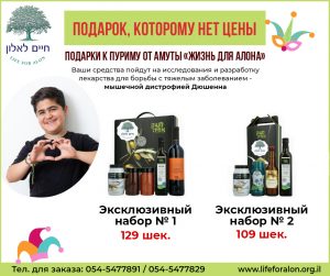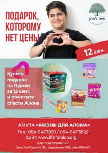 Чтобы помочь Алону и другим детям с МДД, необходимо очень много денег. Каждый год перед праздником Пурим организация «Жизнь для Алона» проводит по всей стране акцию по продаже традиционных подарков («мишлоах манот») по символической цене в 12 шек. В этом году, кроме детских подарков со сладостями будут и более серьезные наборы к Пуриму с вином, оливковым маслом, специями и т. д. по цене 109 и 129 шек. Какой бы набор вы ни выбрали, вы станете участником спасения жизни Алона и других больных детей.
