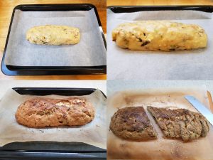 - Каждую булку нарезаем на тонкие бискотто толщиной 0.5-1 см. Укладываем их по одному на противень с бумагой и еще раз запекаем. На этот раз на 150 градусов 25 минут, чтобы они подрумянились и подсохли.