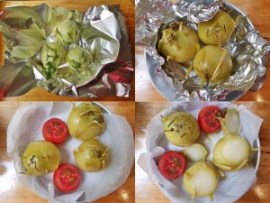 - Готовые овощи прямо с бумагой, перекладываем на тарелку для подачи. На каждый овощ кладем кусочек сыра и посыпаем зеленью орехами.