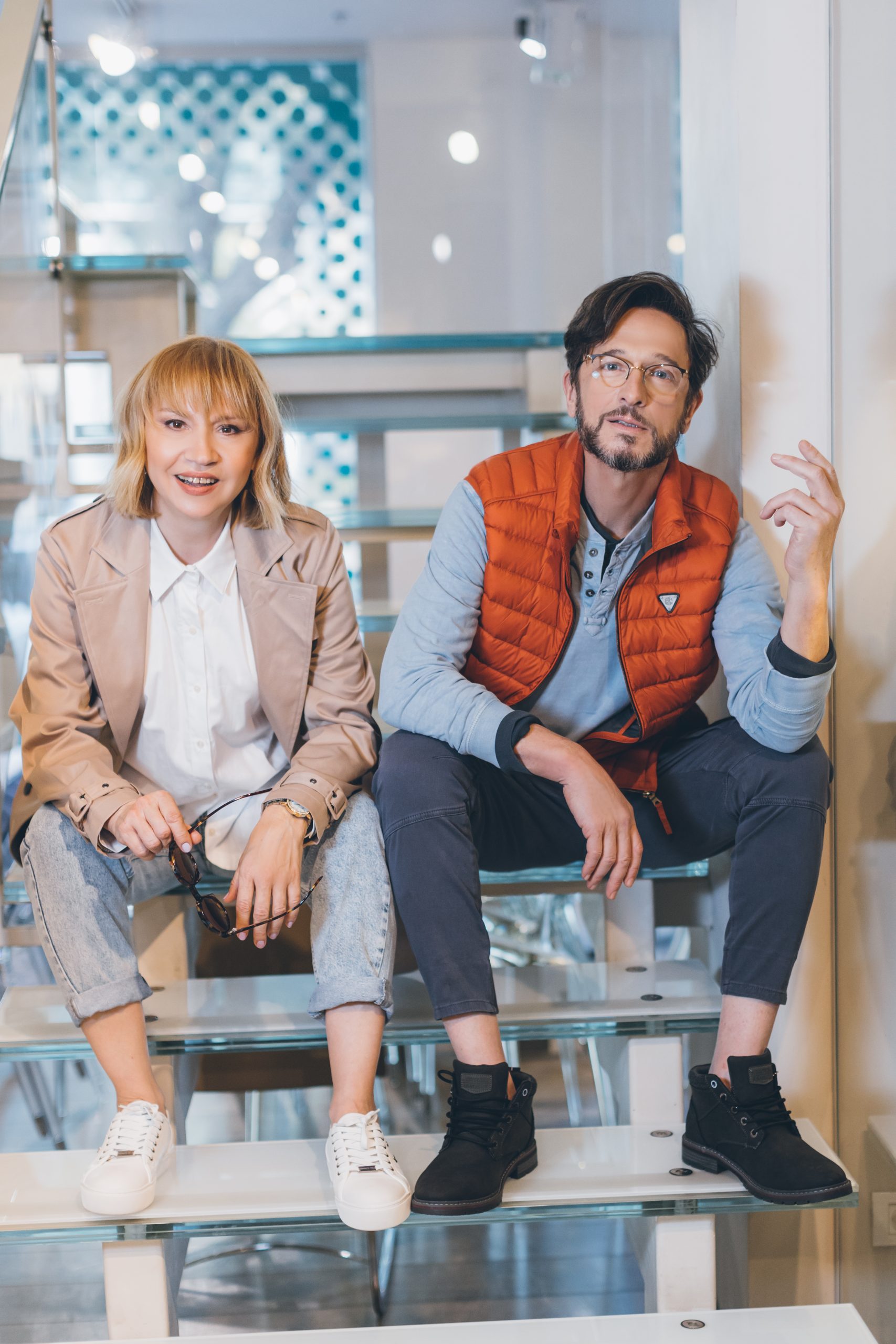 На Саше: яркий элемент – оранжевая жилетка в традиционном образе позволяет классическим сочетаниям выглядеть более свежо. На Свете: голубые джинсы с белыми сникерсами – отличный способ уйти от формальности. Образ: Kenneth Cole New York, Mashbir