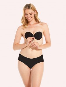 Под платье с открытой спиной, идеально подойдет бра с клеющимися чашечками. В его боковых частях установлены силиконовые крепления, которые отлично удерживают грудь и не дают бюстгальтеру сползти. Главное достоинство этого бюстгальтера в том, что он крепится на груди и по бокам, и вы можете себе позволить вырез на спине любой глубины, потому что она остается полностью открытой. Эта модель настолько незаметна под одеждой, что только вы сможете догадаться, что под открытым платьем скрывается бра.