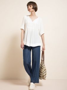 Пожалуй, самая популярная модная тема для праздничных гуляний – легкие брюки и простой верх. Вариант «джинсы-футболка», конечно, вне конкуренции, но мы рекомендуем пофантазировать еще и примерить пару моделей синего цвета из летней коллекции Crazy Line. Во-первых, свободные фасоны выглядят очень эффектно. Во-вторых, у этой марки лекала всегда разрабатываются под израильские фигуры, и можно найти то, что сядет, как влитое. В компанию к брюкам возьмите белую блузку либо лаконичный топ с контрастным принтом. Образ завершат удобные светлые мокасины. Аутфит получится универсальным, и после дня рождения страны точно пригодится в походах на работу и во время прогулок.