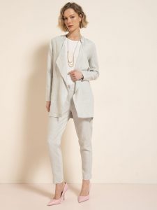 Прямые брюки и пиджак, возвращающийся в список трендов, – отличный выбор для модниц, предпочитающих элегантную классику. Бело-голубые сочетания можно варьировать бесконечно, делая акцент на оба цвета сразу или на один из них, оставляя второму роль небольшой детали, которая освежает look. Эффектный брючный костюм из коллекции Crazy Line – канонический пример того, как при помощи максимально лаконичного фасона и сдержанной расцветки подчеркнуть женственность и привлечь внимание окружающих. Настроение праздника поддержат изящные босоножки на каблуке.