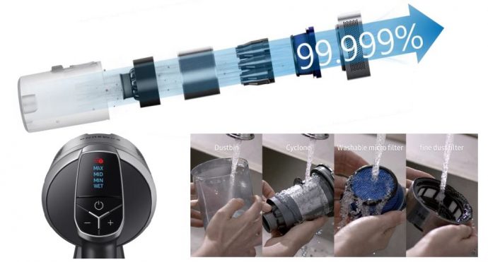 Новый пылесос помогает не только содержать дом в чистоте, но и очищать воздух от пыли. Samsung Jet включает в себя 5-уровневую систему фильтрации HEPA, и каждый из этих уровней имеет трехсторонние вентиляционные отверстия, которые эффективно улавливают мельчайшие частицы пыли, всасываемые пылесосом. Фильтр, который был протестирован и одобрен Британским фондом по борьбе с аллергией (British Allergy Foundation – BAF), является высокоэффективным и улавливает 99,999% частиц пыли и аллергенов, которые обычно имеют тенденцию проникать из пылесоса обратно в воздух.