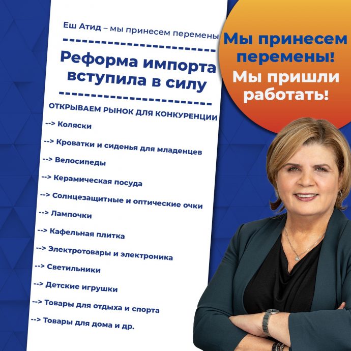 1 июня вступила в силу вступила реформа импорта, инициированная министром экономики Орной Барбивай, и теперь тысячи товаров будут ввозиться в Израиль легко, быстро и по более низкой цене. Также введена в строй инновационная компьютерная система для заявок на импорт и контроля процесса утверждения импортных товаров.
