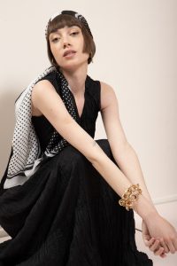 Эффектное черное платье из летней коллекции Crazy Line в сочетании с черно-белым платком – канонический пример того, как при помощи максимально лаконичного фасона и сдержанной расцветки подчеркнуть женственность и привлечь внимание всех мужчин в обозримом радиусе. Такое черно-белое сочетание великолепно подойдет для романтического свидания и прогулок под луной.