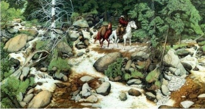 А вот еще одна картина живописца, Бев Дулиттл (Bev Doolittle). Сколько скрытых лиц вы видите здесь?