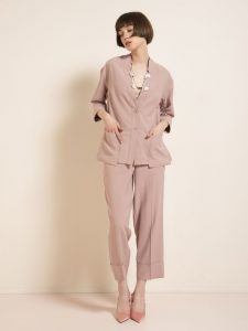 Свободные брюки и жакет теплого персикового оттенка из коллекции Crazy Line смотрится невероятно элегантно. Добавьте аксессуары, туфли на каблуке и получается в меру торжественный look. Этот костюм комплиментарно подчеркнет вашу фигуру, при этом подарит свободу и раскованность движений.