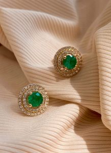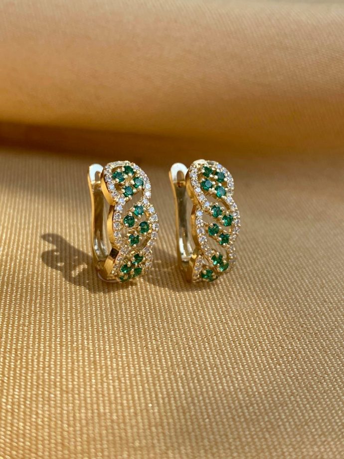 Элитные круглые серьги из желтого золота с изумрудами в центре 0.75 карат и усыпанные россыпью белых бриллиантов 0.46 карат в фабричном магазине бренда вы можете приобрести за 5390 шек.
