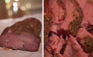 Этот деликатес изготовлен и запечен по старинному венгерскому рецепту c чесноком, молотым черным перцем и мускатным орехом, которые дают мясу особый аромат. Его можно нарезать тонкими ломтиками для сэндвичей или холодной мясной закуски или разогреть или запечь в духовке и подавать как горячее блюдо. Прекрасно сочетается по вкусу с черным хлебом, вареной картошкой, зеленым луком, свежими огурчиками и пр.