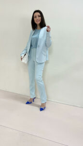 За основу праздничного монохромного комплекта я взяла брючный костюм нежно голубого цвета и блузу более темного оттенка. Такой образ выглядит стильно за счет игры оттенков, и, кстати, градус стиля повышает модная модель жакета без лацканов. Кстати, в весенней коллекции Crazy Line костюмам уделено много внимания, здесь есть самые разнообразные комплекты множества трендовых цветов».