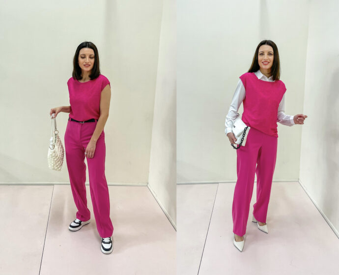 Для первого комплекта я выбрала розовый цвет. Такой образ зрительно будет вытягивать и стройнить силуэт, поскольку в основе лежит единый цветовой столб и нет элементов, которые зрительно режут фигуру. Ремень лишь подчеркивает талию.