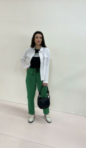 В таких комплектах я рекомендую миксовать фактуры, чтобы образ выглядел интереснее. В нашем случае я выбрала топ из структурированной ткани и брюки из гладкой костюмной ткани. Смешение стилей – спортивного и элегантного сделало образ сложнее, в хорошем смысле слова, и комфортнее.
