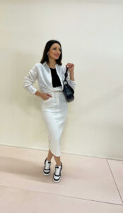 Последний наш образ снова в стиле спорт-кэжуал, однако на этот раз, в сочетании с юбкой. За основу берем привычное и простое черно-белое сочетание. А акцент сделаем на стилизации, в нашем случае, это многослойность и заправленная рубашка с расстегнутыми пуговицами».