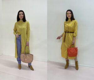 За основу этого образа я взяла льняное платье-рубашку. В сочетании с ремнем и сапогами-казаками получается образ в стиле кантри. Чтобы адаптировать его к городской жизни, дополнила look минималистичной сумкой из экокожи.