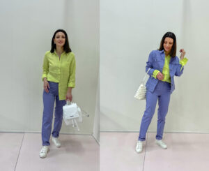 В прохладную погоду, вторым слоем можно надеть куртку, тем самым вы зрительно вытянете силуэт».