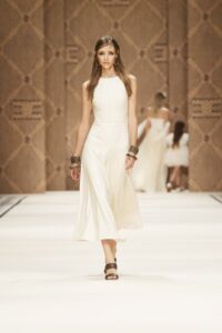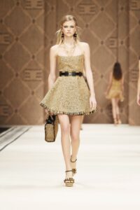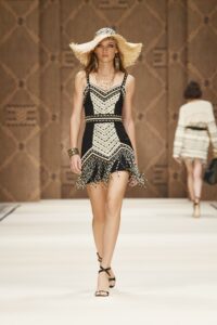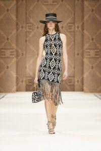 Платья с бахромой – один из главных трендов лета 2023 – это может быть классическая бахрома или просто свисающие нити или шнурки. Дизайнеры допускают любые ее варианты, как впрочем, такая отделка может украшать как все платье, так и его элементы, например, только рукава или только юбку. Только не забывайте, что такой наряд не требует дополнительного декора.