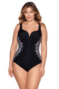 Если ваша задача исключительно визуально постройнеть, то выбирайте корректирующий купальник классического фасона с V-образным вырезом, с косточками на лифе или пуш-ап, которые приподнимут грудь. Для общей корректировки силуэта прекрасно подходят купальники насыщенных оттенков, например, «королевского» синего, цвета морской волны, глубокого бордового или черного. И, разумеется, модели с вертикальными узорами, которые вытягивают весь силуэт.