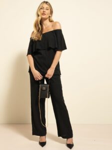 Хорошим выбором, чтобы повеселиться на летнем празднике, станет комплект из топа с открытыми плечами и прямых брюк. Соблазнительно оголенная линия плеч, струящаяся ткань, почти все скрывающая, но намекающая на большее – такое сочетание выглядит эффектным и даже в чем-то роковым.