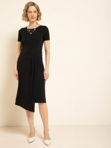 Черный цвет и оригинальный силуэт делают комплимент фигуре. В образ с этим платьем прекрасно впишутся лодочки, впрочем, как и любая обувь на высоком каблуке. Вы будете чувствовать себя привлекательной, и шансов уйти с праздника незамеченной просто не останется.