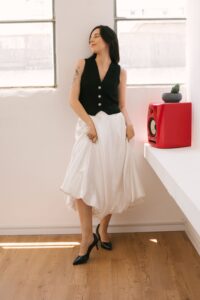 В одном из вечерних вариантов Лина стилизует воздушное платье, с туфлями Tamaris на высоком устойчивом каблуке, пиджаком оверсайз и эффектными украшениями. Образ получился с характером, очень стильным и, при этом, по-летнему легким и расслабленным. В каждом из образов, составленных Линой Майнерман есть своя модная изюминка и туфли Tamaris – это своего рода завершающий штрих.