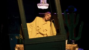 По словам Ренаты Литвиновой, «в этом спектакле костюмы много берут на себя — они уже полноценная часть истории. Иногда мне кажется, что можно ходить и молчать: наряды все скажут за меня». Её героиня меняет платья, произносит монологи, поёт, впадает в тоску и умеет летать — в буквальном смысле слова, она парит прямо под потолком. А её партнеры по сцене – актеры Эрик Ложериа и Елена Терентьева, голубь и кактус…