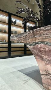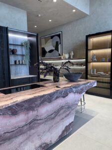 В фасадной части выставочного зала размещена модель кухни, островок которой выполнен из камня необычного оттенка, добытого специально для «Semel», в асимметричной геометрической форме. Кухонные шкафы сделаны из уникальной состаренной древесины с использованием передовых технологий и парящей витриной.