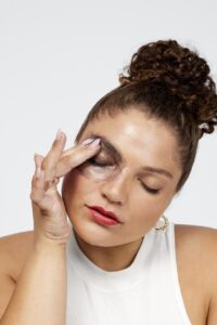 Наносите средство легкими похлопывающими движениями по орбитальной косточке от центра глаза к его внешним краям. Не торопитесь, слегка похлопайте и по векам для легкого антистрессового массажа.