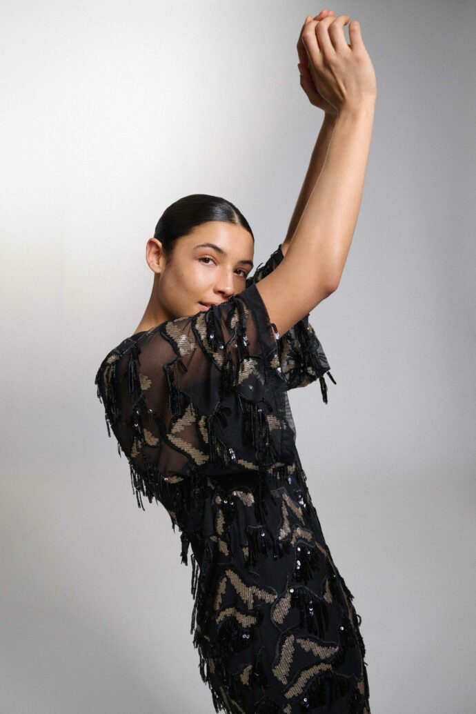 Платье с блестками: выберите шикарное коктейльное платье или вечерний струящийся комбинезон с блеском, пайетками или в металлических оттенках для создания праздничного образа.