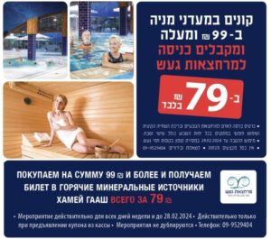 Любимое мероприятие наших покупателей с Хамей гааш вернулось и продлится до 30/01/24. При покупке продуктов в сети на сумму от 99 шек, вы получаете возможность приобрести билет в горячие минеральные источники Хамей Гаш всего за 79 шек (вместо 100 шек в рабочий день или 110 шек в выходной).