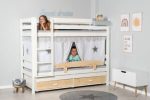 Занавески для двухъярусных кроватей. Это еще один из элементов развивающего декора, который вам предложат в «Эцмале». Занавески создают небольшую и уютную область внутри кровати, где он может уединиться, чтобы читать книгу, играть или просто отдыхать, что помогает ребенку чувствовать себя комфортно и защищенно. Кроме того, они стимулируют воображение и фантазию ребенка и способствуют его творческому развитию. Он может придумывать волшебные игровые миры или превращать свою кровать в замок, космический или пиратский корабль.