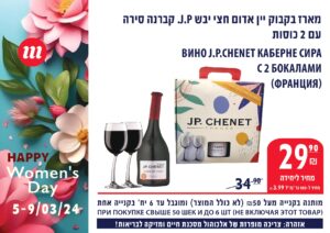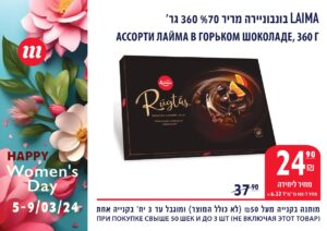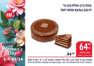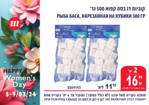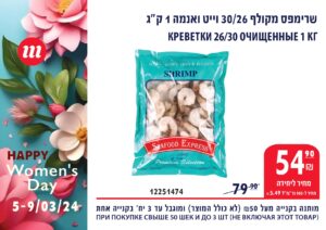 *Указанные цены действительны только с 5.03.24 до 9.03.24 или до окончания запасов, и при условии покупки на 50 шек. и более. Не включая товары, участвующие в мероприятии. Ограничено до 3 штук/килограмм/акций. Цена на колбасу при условии покупки цельным куском, без нарезки.