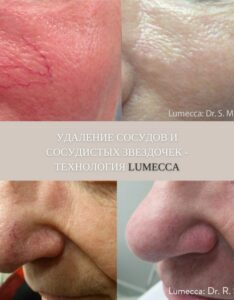 При удалении сосудистых звёздочек воздействие происходит на уровне дермы, где излучение Lumecca поглощается оксигемоглобином – естественным пигментом, который входит в состав красных кровяных клеток, стенки сосуда «запаиваются» и «паутинка» исчезает. Lumecca вполне успешно устраняет любые виды расширенных сосудов.