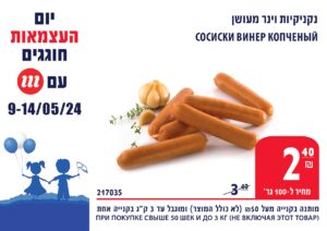 Сардельки Винер Новый 4,90 шек/1 кг вместо 6,90 шек) и сосиски Винер Копченый – 2,40 шек/100 г (вместо 3,40)*.