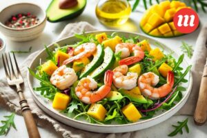 - На тарелке выложите слой рукколы, сверху распределите креветки, манго и авокадо.