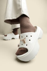 В сети есть десятки сабо на платформе, в футуристическом и геометрическом дизайне, изящных простых линий или нарочито массивных и грубых, с любимыми детьми и взрослыми персонажами, привычные и хитовые модели в новых цветах и с новыми шармами.